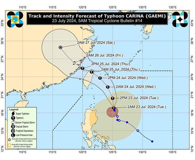 Bản tin dự báo bão của Cơ quan Quản lý Khí quyển, Địa vật lý và Thiên văn Philippines (PASAGA) hồi 5h00 ngày 23.7.2024 cho biết, bão Gaemi (tên địa phương là Carina) duy trì sức mạnh khi di chuyển theo hướng tây tây bắc.