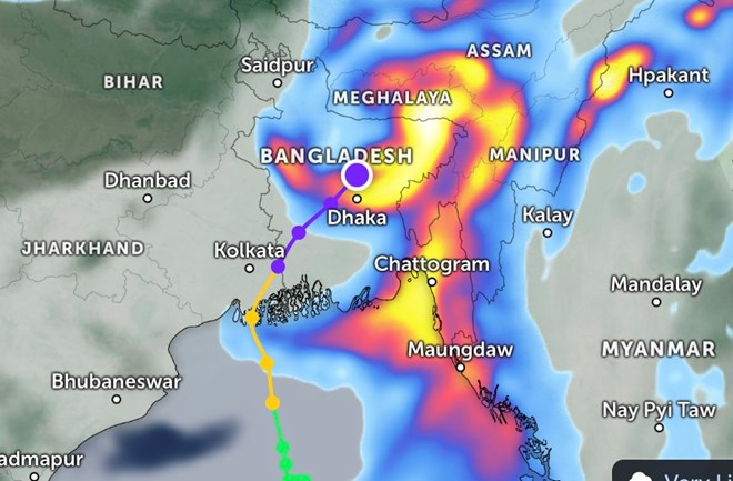 Theo dự báo bão mới nhất lúc 3h16 ngày 28.5 của Cơ quan Khí tượng Ấn Độ, hoàn lưu bão Remal đang quét qua Bangladesh theo hướng đông - đông bắc với tốc độ 15 km/h trong vòng 6 giờ trước đó.