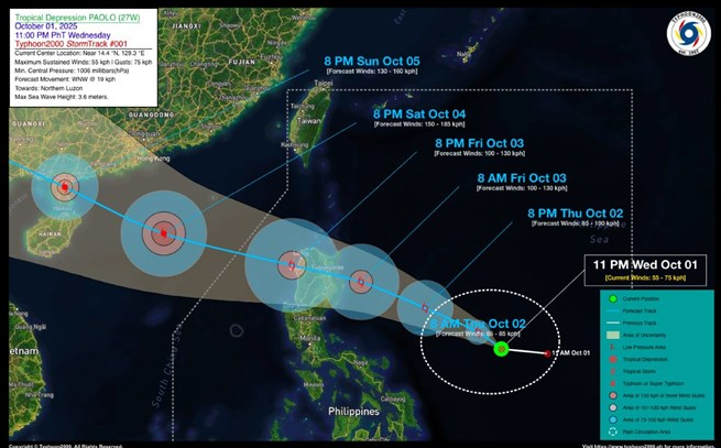 Sáng 2.10, Cục Quản lý Thiên văn, Địa vật lý và Khí tượng Philippines (PAGASA) phát tin bão khẩn cấp cho biết, áp thấp nhiệt đới Paolo đã mạnh lên thành bão. Vào hồi 4h sáng 2.10, vị trí tâm bão ở 14,6 độ Vĩ Bắc, 128,2 độ Kinh Đông, cách tỉnh Quezon (Philippines) khoảng 705km về phía Đông.