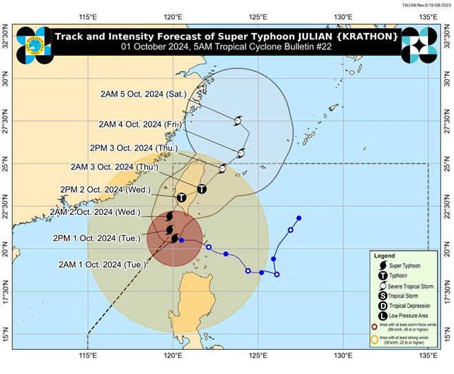 Sáng sớm 1.10, bão Krathon (Julian ở Philippines) mạnh lên thành siêu bão, đi vào khu vực Bắc Biển Đông, trở thành cơn bão số 5 trong năm 2024.