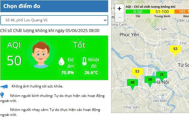 Cụ thể, số liệu quan trắc do Trung tâm Kỹ thuật nông nghiệp và môi trường (Sở Nông nghiệp và Môi trường Hà Nội) công bố lúc 8h30h cho thấy, có 3 khu vực chất lượng không khí ở ngưỡng tốt, là: Số 50 Đào Duy Từ (quận Hoàn Kiếm), chỉ số AQI ở mức 31; xã An Khánh (huyện Hoài Đức) ở mức 48 và phố Lưu Quang Vũ, phường Trung Hòa (quận Cầu Giấy) ở mức 50. Có 2 khu vực chất lượng không khí ở ngưỡng trung bình, là: Xã Vân Hà (huyện Đông Anh) và phường Minh Khai (quận Bắc Từ Liêm) có chỉ số AQI ở mức 53.