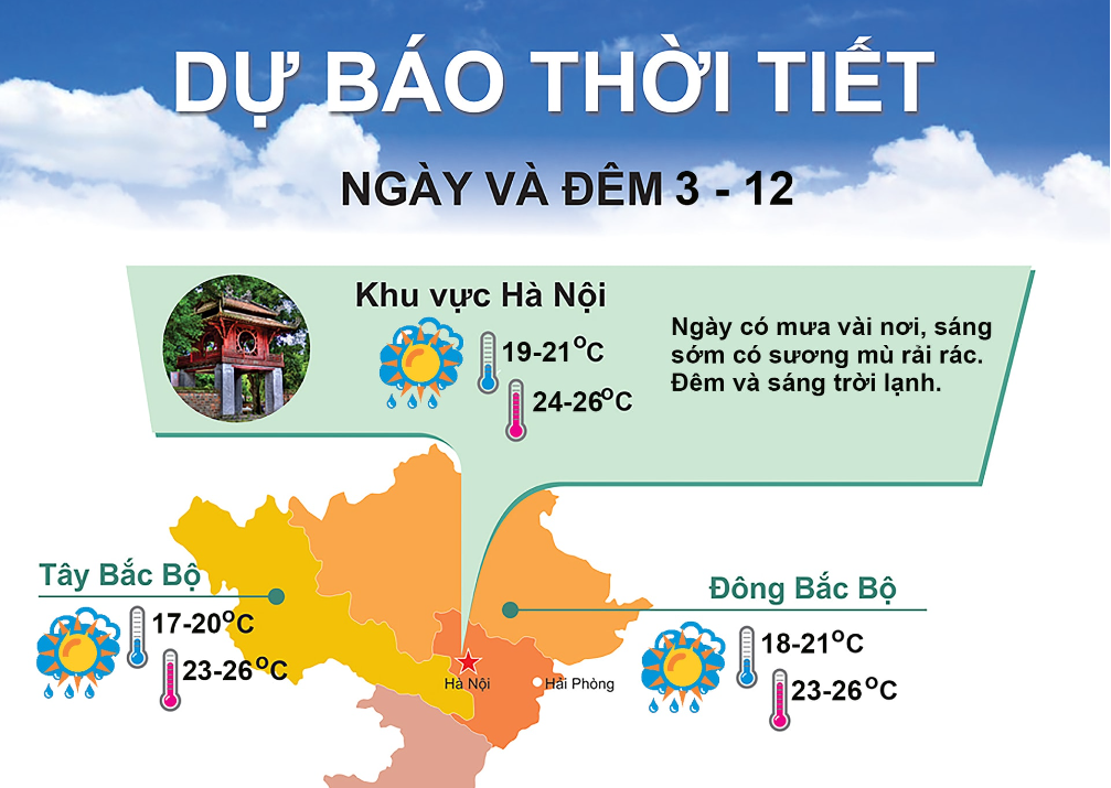 Hôm nay (3-12), Hà Nội ngày có mưa vài nơi, sáng sớm có sương mù rải rác. Đêm và sáng trời lạnh.