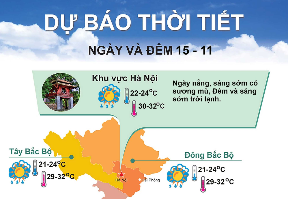 Hôm nay Hà Nội (15-11), ngày nắng, sáng sớm có sương mù. Đêm và sáng sớm trời lạnh.