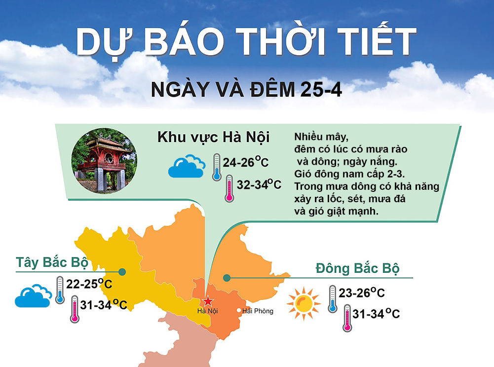 Hôm nay 25-4, Hà Nội nhiều mây, đêm có lúc có mưa rào và dông; ngày nắng. Gió đông nam cấp 2-3. Trong mưa dông có khả năng xảy ra lốc, sét, mưa đá và gió giật mạnh.