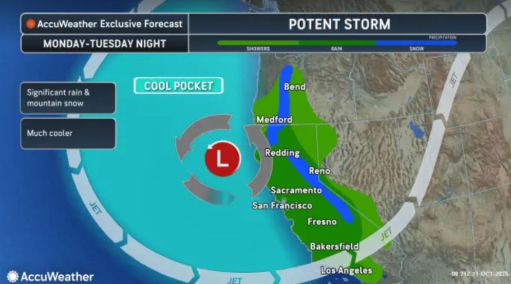Sau đợt bão đầu tiên, một cơn bão mới từ Thái Bình Dương sẽ tràn vào nước Mỹ đầu tuần này, đi kèm khối ẩm nhiệt đới còn sót lại từ các cơn bão Priscilla và Raymond. Lượng hơi ẩm lớn này sẽ kích hoạt mưa dông mạnh từ California đến miền Tây Nam nước Mỹ, đồng thời gây không khí lạnh, kéo nhiệt độ xuống rõ rệt.