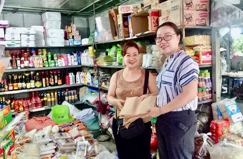 Hội Liên hiệp phụ nữ phường Việt Hưng (quận Long Biên) tặng túi giấy cho hộ kinh doanh tại chợ dân sinh. Ảnh: Thu Trang