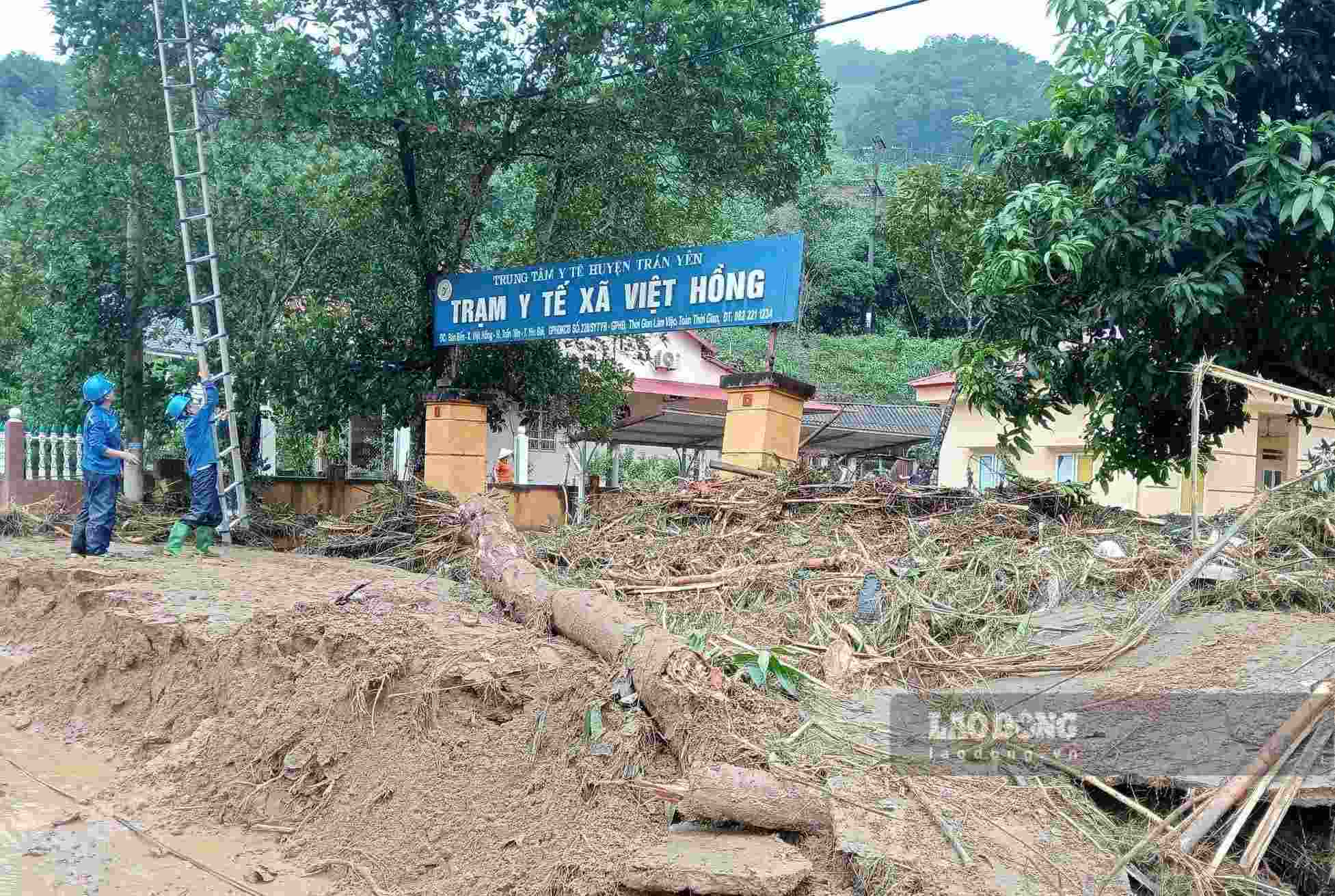 Toàn bộ tường rào Trạm Y tế xã Việt Hồng bị sập, nhiều phòng khám và trang thiết bị y tế chìm trong nước lũ và bùn đất. Ảnh: Văn Đức