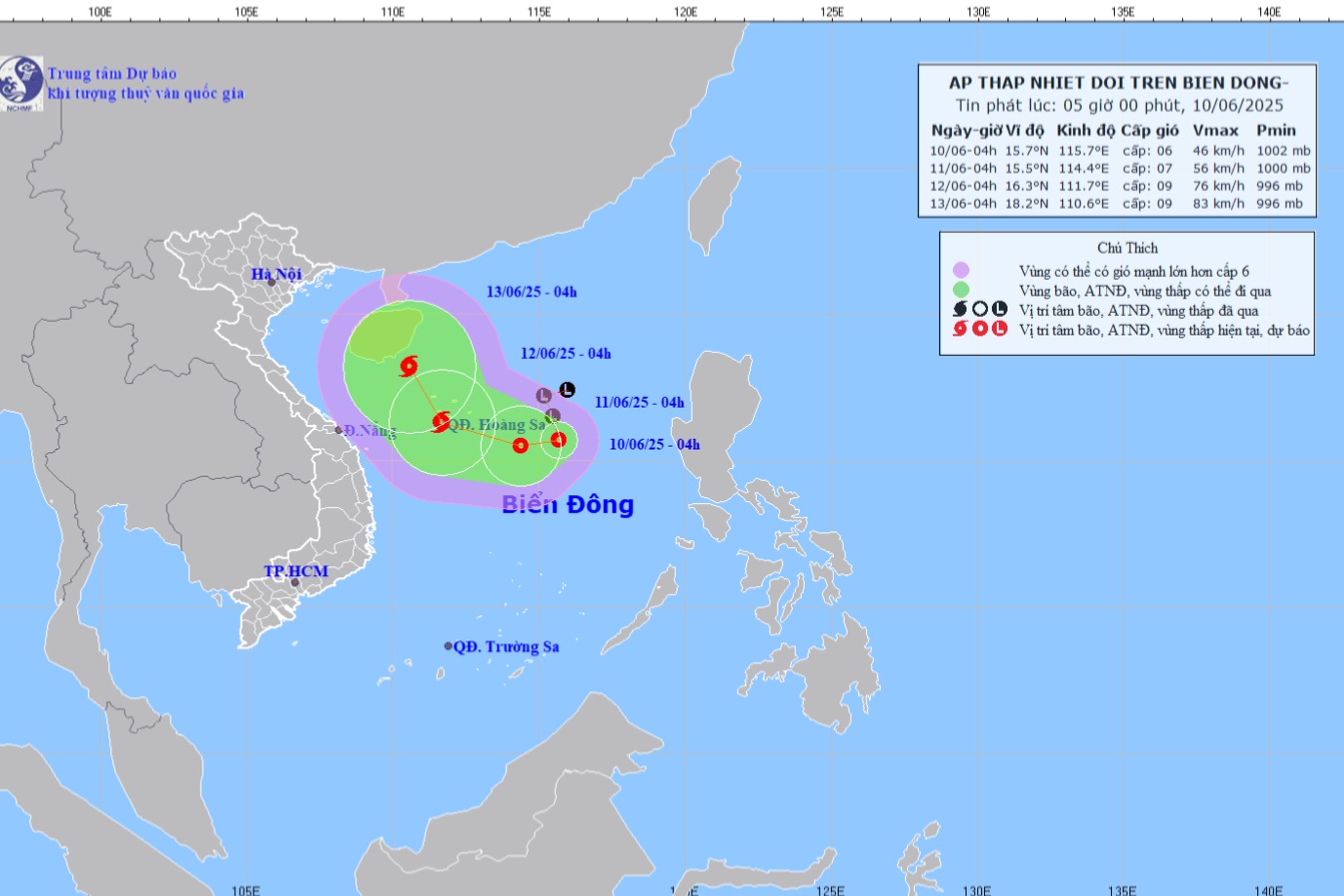Đến 4h ngày 12/6, áp thấp nhiệt đới có khả năng mạnh lên thành bão, di chuyển theo hướng Tây Tây Bắc với tốc độ 10–15km/h. Vị trí dự báo lúc này trên khu vực quần đảo Hoàng Sa, khoảng 16,3 độ Vĩ Bắc; 111,7 độ Kinh Đông.