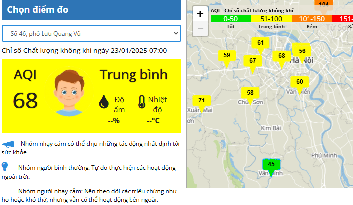 Thực tế, số liệu từ cổng thông tin quan trắc môi trường của Sở Tài nguyên và Môi trường Hà Nội (moitruongthudo.vn) ghi nhận từ 7h-8h, có 9 điểm quan trắc chất lượng không khí ở ngưỡng trung bình, 1 điểm tốt và 1 điểm kém. Chỉ số AQI dao động từ 45-104. Khu vực có chỉ số AQI cao nhất trong buổi sáng hôm nay (23-1) là xã Vân Hà (huyện Đông Anh), ở ngưỡng 104.