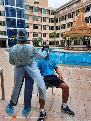 Các cầu thủ lấy mẫu test nhanh Covid-19 sáng 22.2 tại khách sạn
