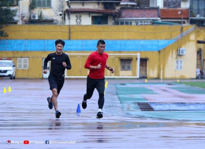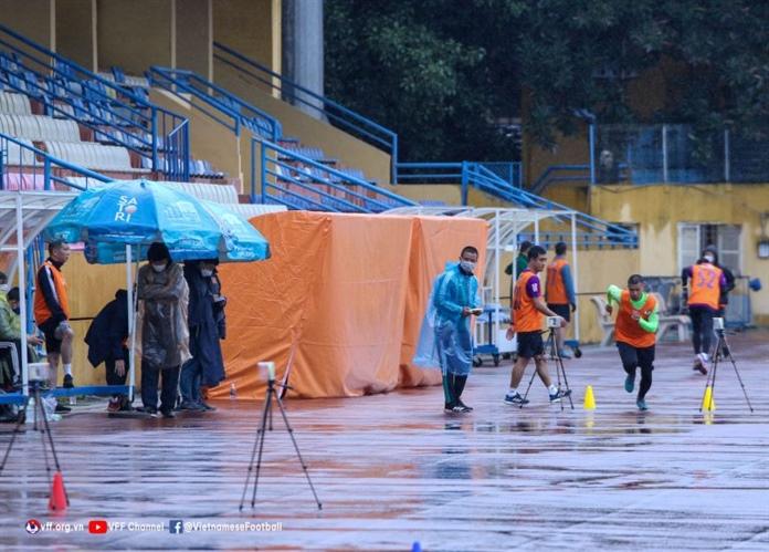 Trọng tài V.League kiểm tra bài thể lực trong thời tiết mưa lạnh