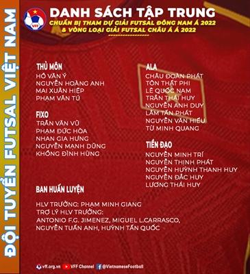 Danh sách 22 cầu thủ tập trung của tuyển Futsal Việt Nam. Ảnh: VFF
