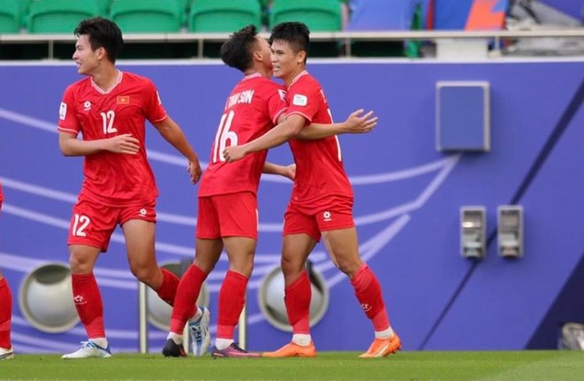 Tiền đạo Phạm Tuấn Hải (ngoài cùng, bên phải) ghi bàn vào lưới tuyển Nhật Bản tại Asian Cup 2023. Ảnh: Quỳnh Anh
