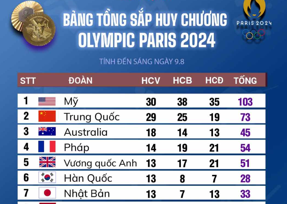 Bảng tổng sắp huy chương Olympic 2024 mới nhất ngày 9.8