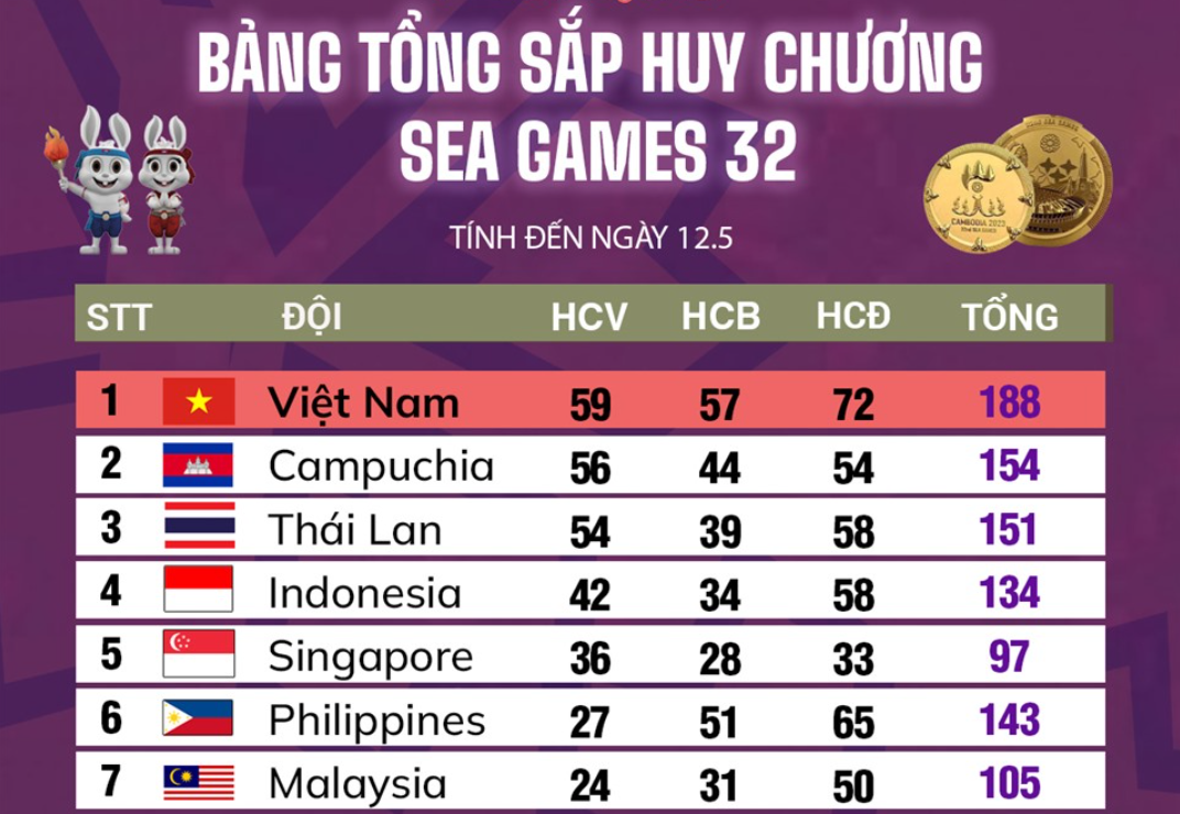 Tính đến 12h00 ngày 12.5, đoàn thể thao Việt Nam có tổng cộng 59 huy chương vàng, 57 huy chương bạc, 72 huy chương đồng, tạm thời đứng thứ nhất trên bảng tổng sắp SEA Games 32.