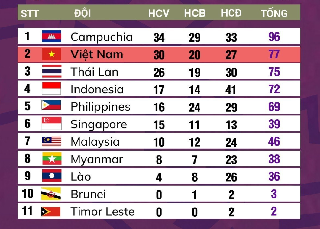 Campuchia vẫn đang dẫn đầu về số huy chương vàng (34). Nhưng đoàn Việt Nam thi đấu thành công nhất hôm nay khi giành 15 huy chương vàng, Thái Lan có thêm 10 huy chương vàng, Singapore có thêm 6 vàng.