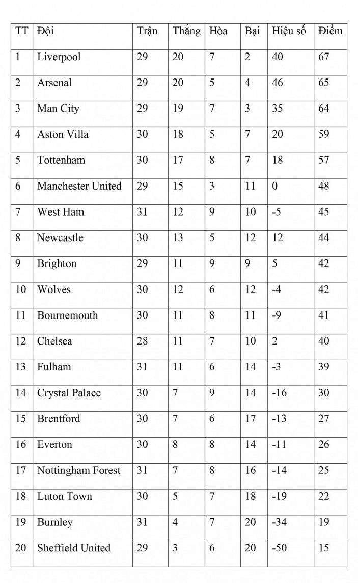 Bảng xếp hạng ngoại hạng Anh hôm nay: