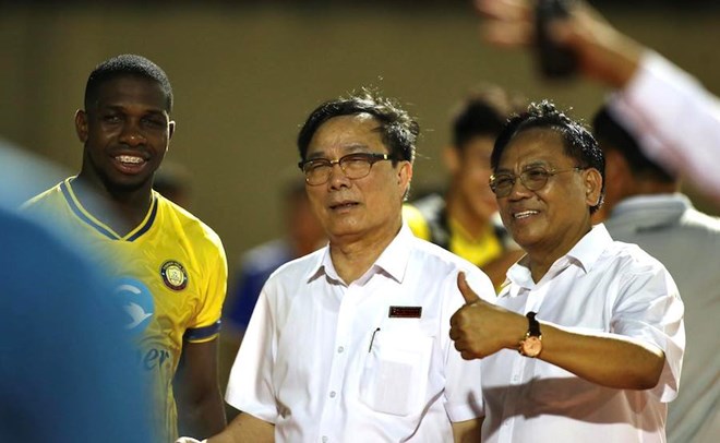 Bầu Đệ đến cổ vũ câu lạc bộ Thanh Hóa và chúc mừng đội bóng vào chung kết Cúp Quốc gia. Ảnh: An Nguyên