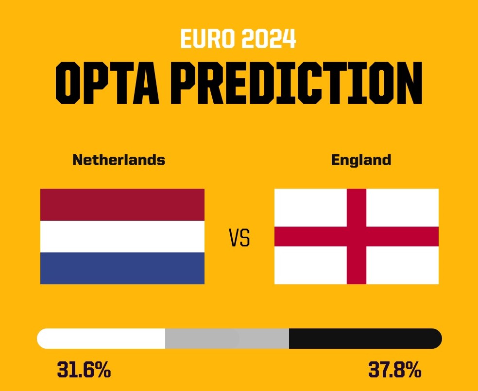 01h50: Theo dự đoán của siêu máy tính, tuyển Anh có 37,8% khả năng thắng, trong khi cơ hội của tuyển Hà Lan là 31,6%.