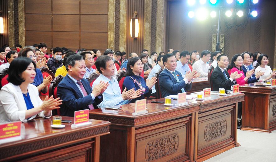 Các đồng chí lãnh đạo thành phố Hà Nội và các đại biểu dự lễ tuyên dương, khen thưởng.