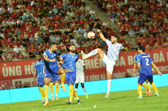Hải Phòng (áo trắng) đã thắng Khánh Hòa 2-1 trên sân Lạch Tray ở mùa giải V.League 2023. Ảnh: VPF