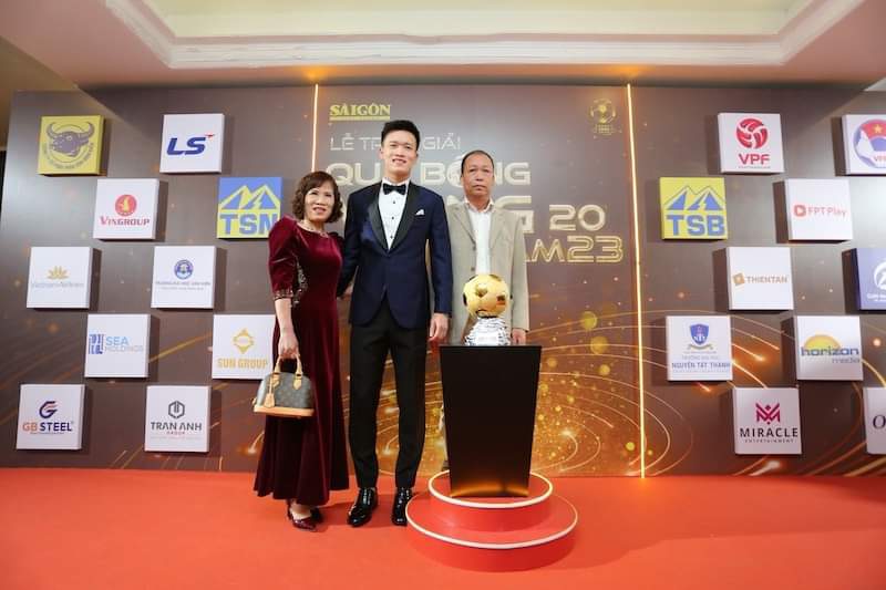 Tiền vệ Hoàng Đức diện vest đen lịch lãm, xuất hiện cùng bố mẹ tại buổi Gala. Tiền vệ của Thể Công Viettel cạnh tranh trực tiếp với tiền đạo Phạm Tuấn Hải (Hà Nội FC) cho danh hiệu Quả bóng vàng Việt Nam 2023.