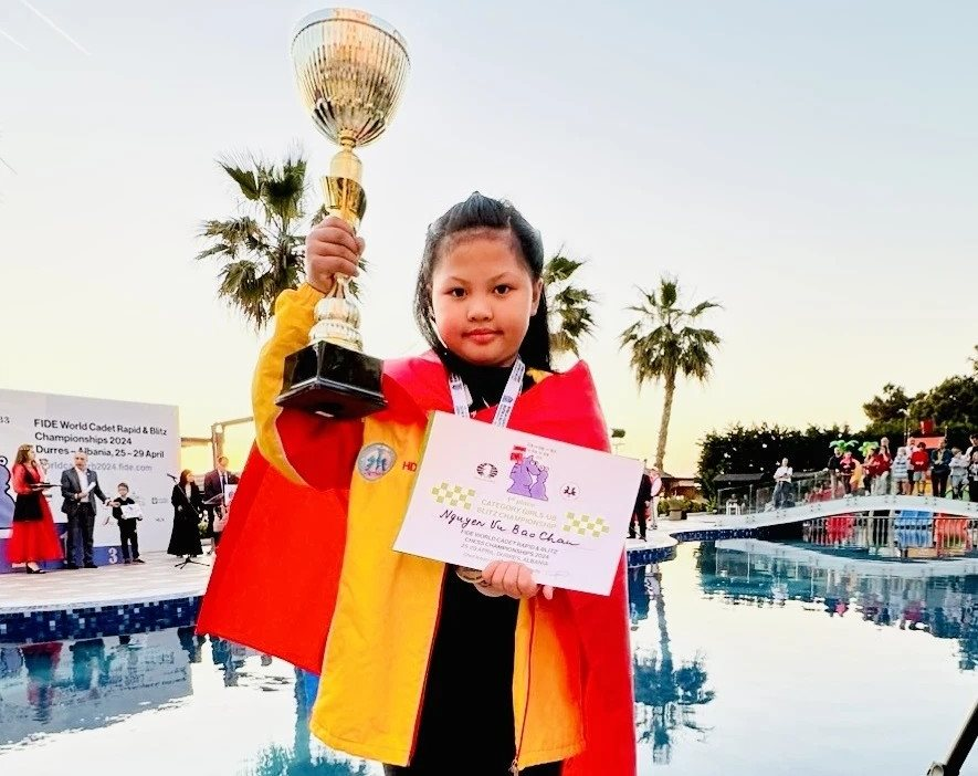 Kỳ thủ nhí Nguyễn Vũ Bảo Châu giành huy chương vàng (HCV) cờ chớp U8 nữ tại giải vô địch cờ nhanh, cờ chớp thiếu niên thế giới 2024.