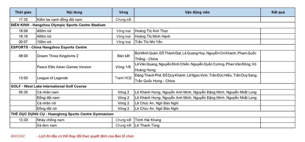 Lịch thi đấu đoàn thể thao Việt Nam tại ASIAD 19 ngày 29.9