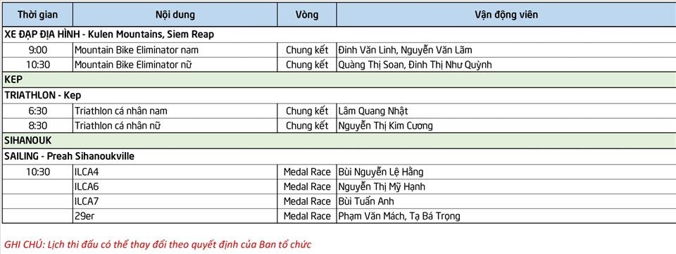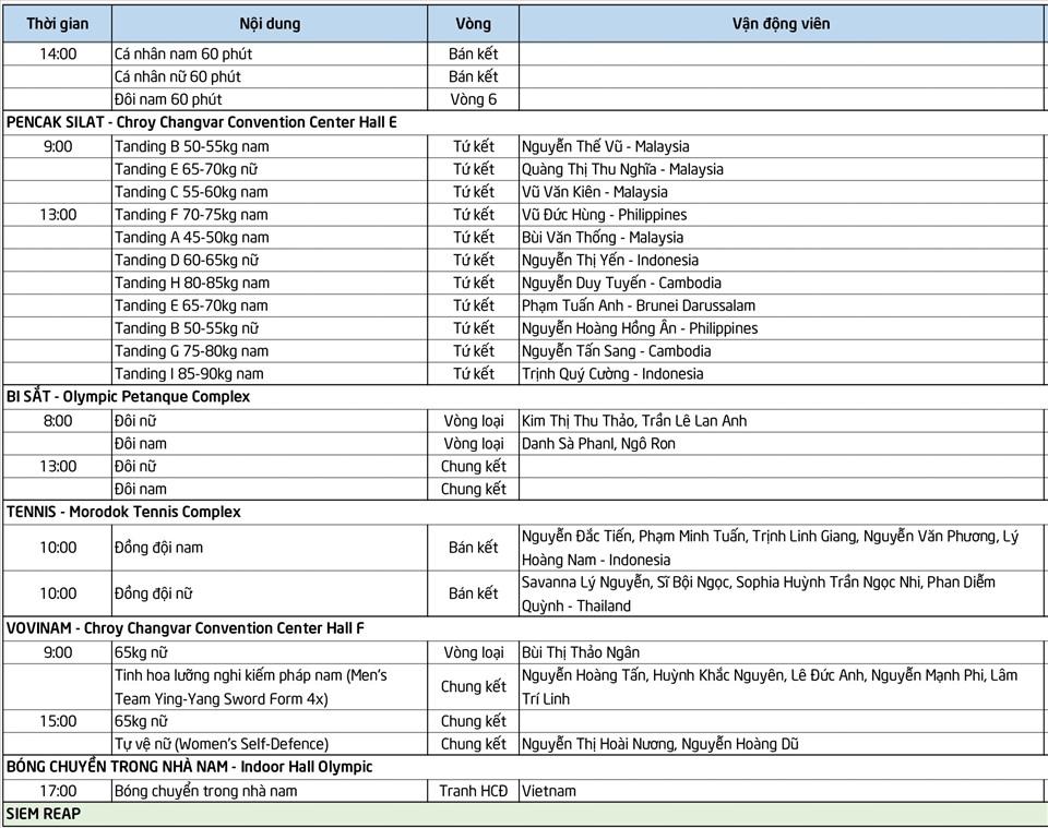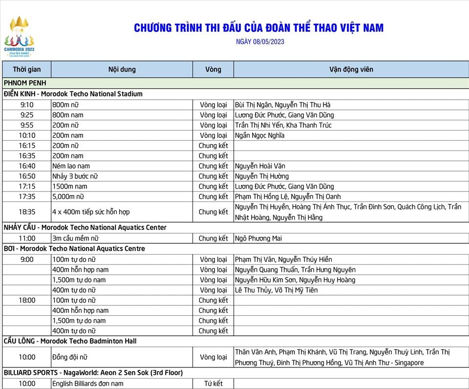 Lịch thi đấu SEA Games 32 đoàn thể thao Việt Nam ngày 8.5