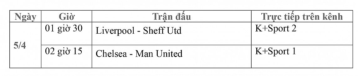 Theo đó, rạng sáng ngày 5/4/2024, vòng 31 Ngoại hạng Anh mùa giải 2023/24 sẽ tiếp tục diễn hai ra trận đấu tâm điểm: Liverpool gặp Sheff Utd, Chelsea đối đầu Man United.