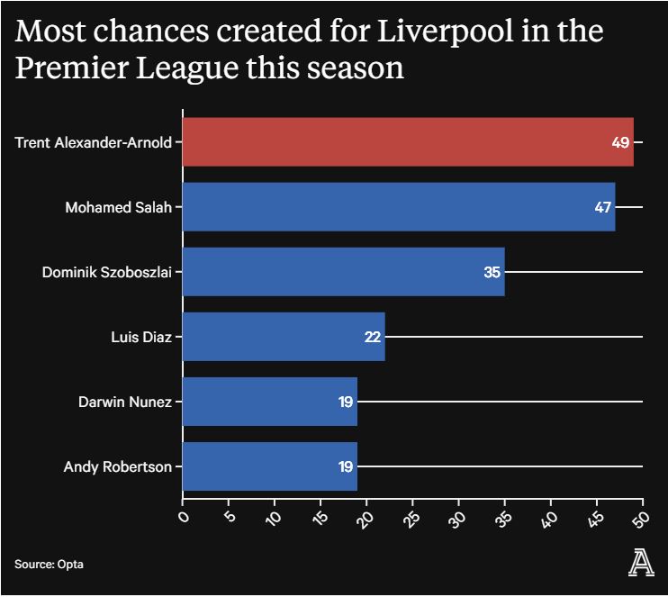 Số cơ hội lớn và số đường chuyền mở ra cơ hội của Alexander-Arnold từ đầu mùa cao nhất Liverpool. Ảnh: The Athletic/Opta
