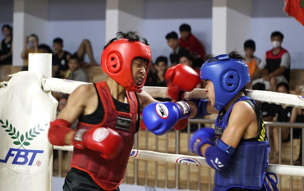 Trận chung kết ở hạng cân 45kg nam (13-14 tuổi) giữa võ sĩ Trần Hưng Nam Việt (giáp đỏ) và võ sĩ Nguyễn Duy Khang (giáp xanh)