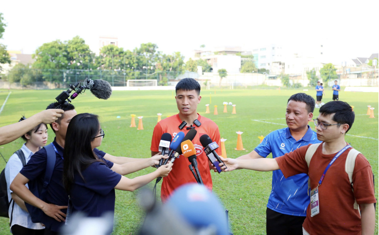 Trung vệ Bùi Tiến Dũng chia sẻ với báo chí. Ảnh Hữu Tuấn