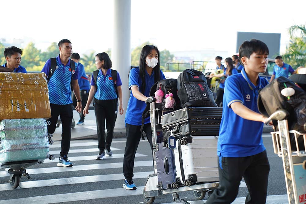Tuyển futsal nữ Việt Nam ở sân bay Tân Sơn Nhất. Ảnh: Thanh Vũ
