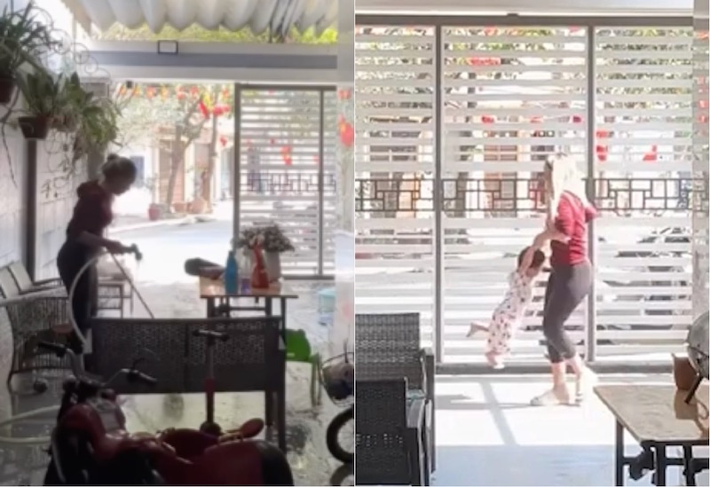 Bà xã Xuân Son tranh thủ dọn nhà, đón chồng về Nam Định ăn Tết Nguyên đán. Ảnh: Cắt từ clip