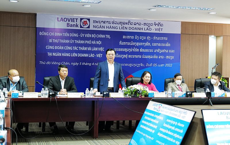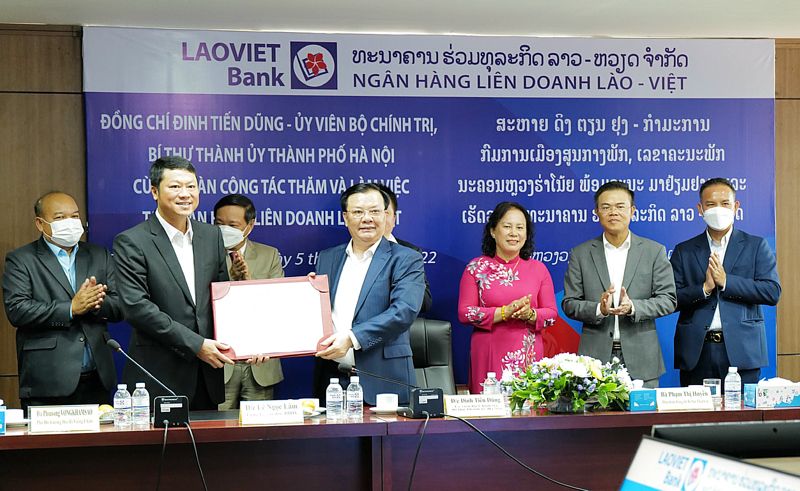 * Cùng ngày, Đoàn đại biểu cấp cao thành phố Hà Nội cũng đã tới thăm Ngân hàng liên doanh Lào - Việt tại Thủ đô Viêng Chăn. Đây là ngân hàng liên doanh đầu tiên của Việt Nam tại Lào từ năm 1999 đến nay, là mô hình hợp tác hiệu quả giữa 2 nước trong thời kỳ đổi mới, là định chế tài chính đặc biệt, cầu nối thanh toán, góp phần thúc đẩy hợp tác kinh tế giữa Việt Nam - Lào, Lào - Việt Nam. Sau 23 năm hoạt động, Ngân hàng Liên doanh Lào - Việt đã có bước trưởng thành vững chắc, hoạt động kinh doanh hiệu quả, nằm trong tốp 3 ngân hàng thương mại lớn nhất tại Lào và đứng đầu các ngân hàng thương mại có vốn Việt Nam hoạt động tại Lào.