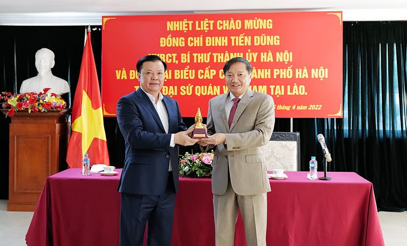 Ủy viên Bộ Chính trị, Bí thư Thành ủy Hà Nội Đinh Tiến Dũng tặng quà lưu niệm Đại sứ quán Việt Nam tại Lào