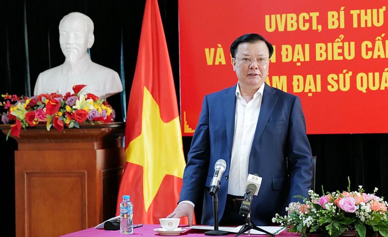 Gặp mặt thân tình với lãnh đạo, cán bộ và nhân viên Đại sứ quán Việt Nam, sau khi nghe Đại sứ Nguyễn Bá Hùng báo cáo về tình hình, kết quả công tác trong những năm qua, Ủy viên Bộ Chính trị, Bí thư Thành ủy Hà Nội Đinh Tiến Dũng đã thông tin khái quát về tình hình phát triển kinh tế - xã hội của Thủ đô Hà Nội thời gian qua; nhấn mạnh trong bối cảnh dịch Covid-19 rất khó khăn, nhưng thành phố đã huy động sức mạnh của cả hệ thống chính trị và nhân dân chung sức, đồng lòng vào cuộc. Nhờ đó, Hà Nội đã chuyển sang trạng thái “thích ứng an toàn, linh hoạt, kiểm soát có hiệu quả dịch Covid-19” và đang kiểm soát tốt tình hình. Số ca mắc Covid-19 mới phát sinh đang giảm mạnh. Trong tổng số ca mắc, có 99,3% không triệu chứng hoặc triệu chứng nhẹ và được điều trị tại nhà. Thành phố đã tiêm mũi 2 cho người dân trên 12 tuổi đạt 99,8%, mũi 3 cho người dân trên 18 tuổi đạt tỷ lệ 87,1% và đang lên kế hoạch tiêm cho trẻ em từ 5 đến dưới 12 tuổi.