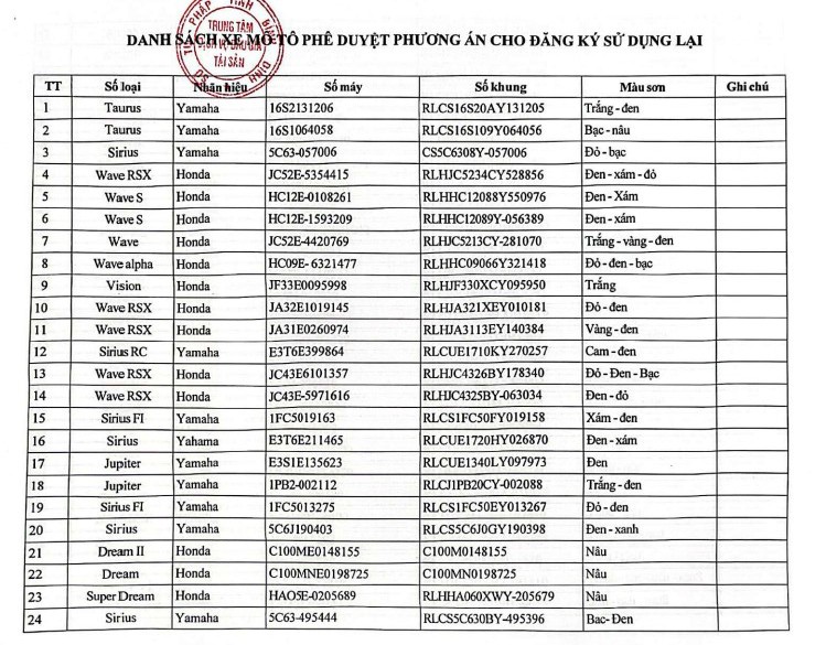 | (Danh sách xe mô tô đã thông qua Biên bản định giá tài sản ngày 13/4/2024 của Hội đồng xác định giá khởi điểm phương tiện vi phạm hành chính trên lĩnh vực giao thông đường bộ, kèm theo Thông báo số 78/TB-TTĐGTS của Trung tâm dịch vụ đấu giá tài sản) |