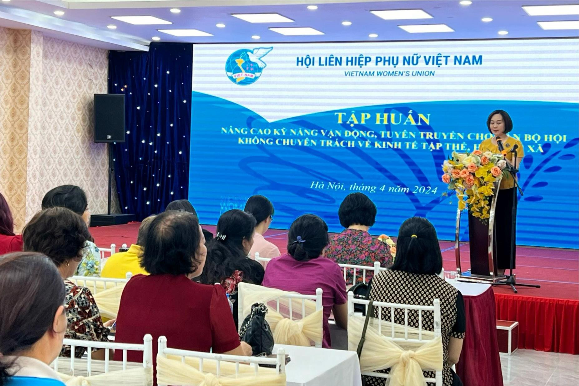 Trong 3 ngày, từ ngày 25 đến 27-4, Hội Liên hiệp phụ nữ thành phố Hà Nội tổ chức tập huấn nâng cao nhận thức, kỹ năng vận động, tuyên truyền cho đội ngũ cán bộ Hội không chuyên trách về hỗ trợ phát triển kinh tế tập thể, hợp tác xã năm 2024.