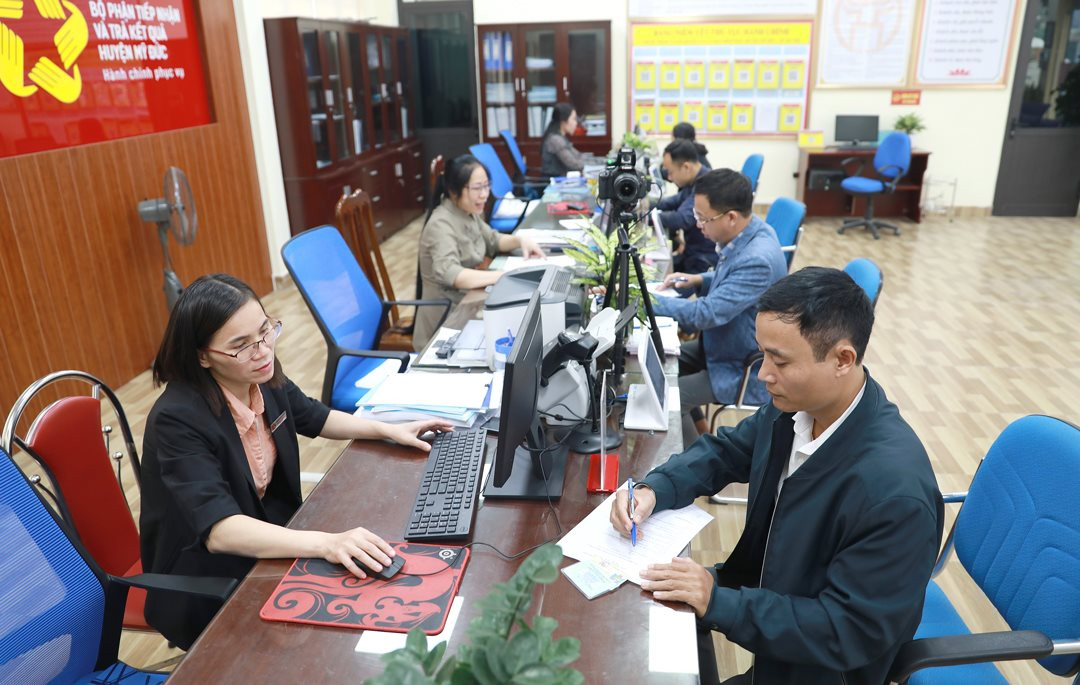 Giải quyết thủ tục hành chính cho người dân tại bộ phận “một cửa” UBND huyện Mỹ Đức. Ảnh: Nguyễn Quang
