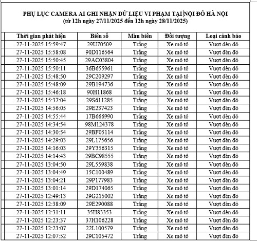 Cục Cảnh sát giao thông cho biết từ 12 giờ ngày 27.11.2025 đến 12h ngày 28.11.2025, qua trích xuất dữ liệu từ camera AI được thí điểm lắp đặt tại nội đô Hà Nội (nút giao phố Phạm Văn Bạch - Hoàng Quán Chi), đã tự động phát hiện 29 trường hợp không chấp hành hiệu lệnh của đèn tín hiệu - vượt đèn đỏ.
