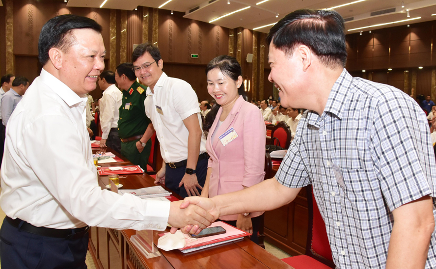 Bí thư Thành ủy Hà Nội Đinh Tiến Dũng với các đại biểu dự hội nghị.