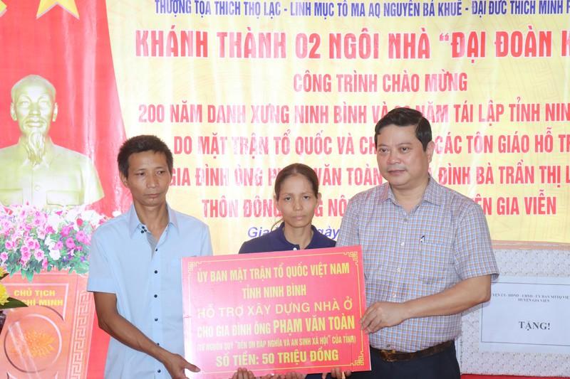 Phó Chủ tịch Thường trực Uỷ ban MTTQ Việt Nam tỉnh Ninh Bình Lê Văn Kiên trao tặng 50 triệu đồng cho hộ gia đình anh Phạm Văn Toàn. |