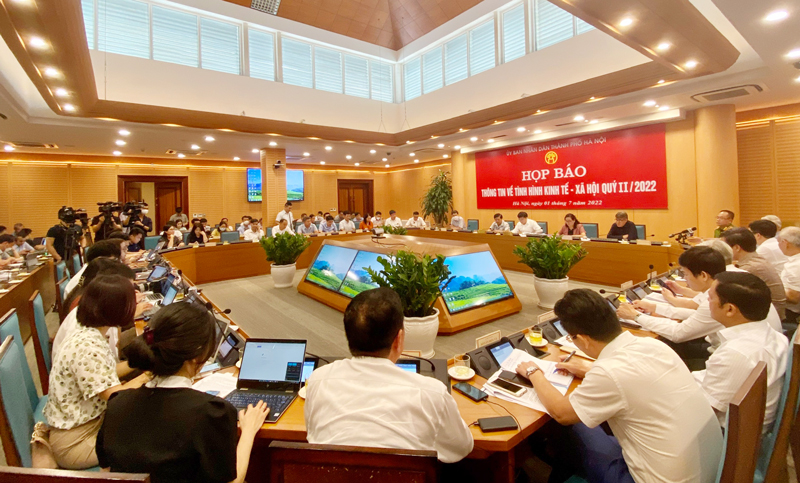 Chiều 1-7, UBND thành phố Hà Nội tổ chức họp báo thông tin về tình hình kinh tế - xã hội quý II-2022. Đồng chí Trương Việt Dũng, Chánh Văn phòng, người phát ngôn UBND thành phố chủ trì buổi họp báo.
