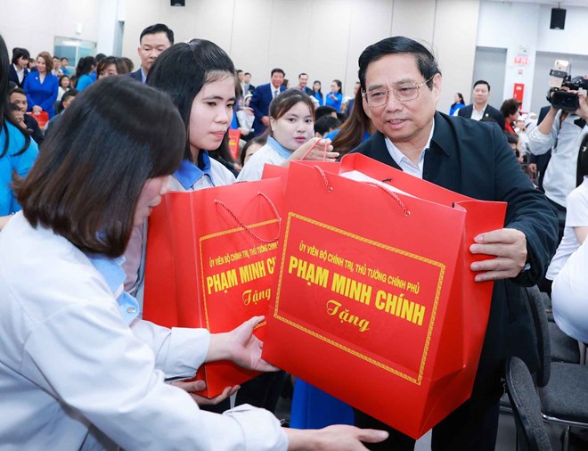 Thủ tướng Chính phủ Phạm Minh Chính tặng quà công nhân, người lao động có hoàn cảnh khó khăn tại Công ty Kefico thuộc Tập đoàn Hyundai Motor, khu công nghiệp Đại An, tỉnh Hải Dương ngày 10.1.2024. Ảnh: Hải Nguyễn