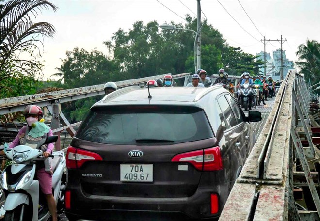 Mặt cầu Rạch Đỉa nhỏ hẹp chỉ 3 m - 3,5 m, chỉ cần một chiếc ô tô đi qua cầu là gây ùn tắc. Ảnh: Minh Quân