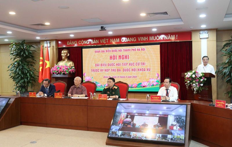Tại hội nghị, cử tri đã nghe đại biểu Nguyễn Quốc Duyệt (Ủy viên Ban Thường vụ Thành ủy, Tư lệnh Bộ Tư lệnh Thủ đô Hà Nội) báo cáo về dự kiến nội dung kỳ họp thứ ba, Quốc hội khóa XV, đại biểu Nguyễn Trúc Anh (Giám đốc Sở Quy hoạch và Kiến trúc Hà Nội) báo cáo tổng hợp trả lời của các bộ, ngành và thành phố Hà Nội về ý kiến, kiến nghị của cử tri 3 quận trong kỳ tiếp xúc trước.