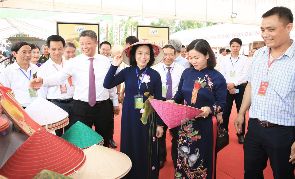 Các đồng chí lãnh đạo, nguyên lãnh đạo thành phố Hà Nội tham quan các gian trưng bày sản phẩm OCOP, sản phẩm làng nghề tại Festival nông sản, sản phẩm OCOP gắn kết du lịch Hà Nội năm 2022.