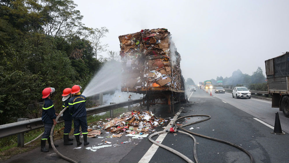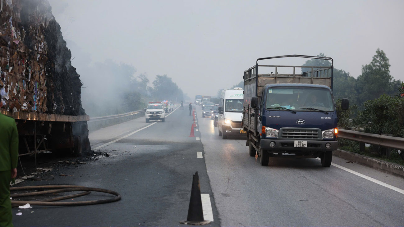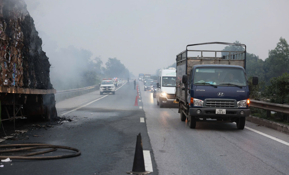 Thời điểm trên, một xe sơ mi rơ-moóc chở phế liệu di chuyển theo hướng Hà Nội - Lào Cai bất ngờ bốc cháy tại vị trí Km42+300 thuộc địa bàn xã Tiên Lữ (Phú Thọ).